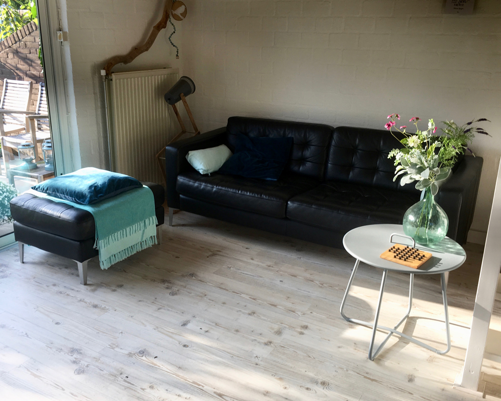 De woonkamer heeft een grote schuifpui, een 3-persoonsbank, een fauteuil, een eettafel met vier stoelen en een smart-tv. Je vind er spelletjes, speelgoed en een omgeving-informatie-map.